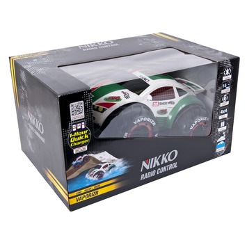 Stoere op afstand bestuurbare Nikko auto model Vaporizr. Deze auto rijdt op het land met een snelheid van ca. 15 km/u en kan ook in het water racen. Met 2 motoren en volledige 4X4 wheel drivefunctie. Lengte 29 cm. Compleet met 6 V-accu, 1-uurs snellader en 9 V-batterij. Vanaf 8 jaar. 1 jaar fabrieksgarantie.