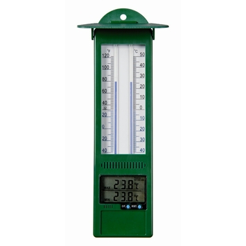 De Nortene thermometer Kelvin 15 is gemaakt van kunststof. De thermometer geeft de temperatuur zowel analoog als digitaal aan. Ook onthoud deze meter de hoogste en de laagste temperatuur. Je kunt de thermometer eventueel ook resetten, zodat je de gegevens van elk seizoen weer opnieuw kunt meten. Denk goed na over de plek waar je de thermometer wilt ophangen, vol in de zon of schaduw kan de gegevens vervalsen.