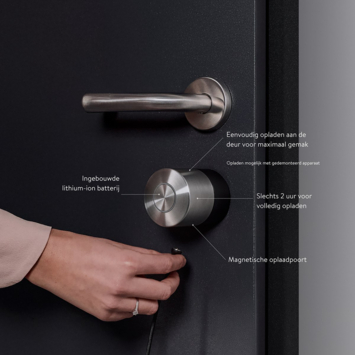 De hoogwaardige roestvrijstalen behuizing en verwisselbare ringen (zwart en wit) zorgen voor een strakke, moderne look die bij elke deur past. Dankzij opladen via USB-C is de batterij in 2 uur weer vol – goed voor 4 tot 9 maanden gebruik.