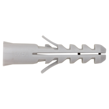 De OK Basisplug nylon Ø 10mm, de meest gebruikte plug voor toepassing in massieve bouwmaterialen, zoals beton en massieve steen. U koopt de basisplug per 75 stuks. De basisplug is 50mm lang en heeft diepe vertanding. Zo bevestigt u met deze plug middelzware materialen aan muren en wanden, bijvoorbeeld schilderijen, plinten en legplanken. De Wij adviseren een schroef van tussen 6 en 8mm te gebruiken met een lengte van 60mm. Als minimale boordiepte adviseren wij 55mm aan te houden.