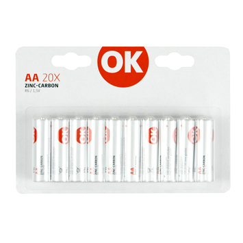 OK Batterij Zinc AA 20 stuks ook bekend als LR6, MN1500, AM3, UM3, HP7, D14, mignon of penlite. Zijn geschikt voor verschillende toepassingen zoals fotocamera's, zaklampen, afstandsbedieningen en speelgoed. In één verpakking zitten 20 AA batterijen.