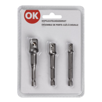 De Ok dopsleutelhouderset bevat 3 dopsleutelhouders. De set bestaat uit een drietal houders in de maten 1/2" (72mm), 3/8"(65mm) en 1/4" (65mm)