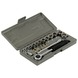 De OK dopsleutelset 3/8" 7-21 mm is een complete 21-delige set bestaande uit 1 ratel (3/8 inch), doppen in de maten 7, 8, 10, 11, 12, 13, 14, 16, 17, 18, 19 en 21 millimeter, 1 verlengstuk, 1 aansluitstuk voor bitjes en 6 verschillende bitjes. De OK dopsleutelset 3/8" 7-21 mm wordt praktisch en netjes bijeengehouden in een stevige en overzichtelijke kunststof opbergbox.