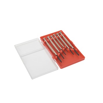 De OK precisieschroevendraaierset is een 6-delige set met mini schroevendraaiers voor het fijnere werkzaamheden aan bijvoorbeeld horloges en brillen. De set bestaat uit 2 kruiskop schroevendraaiers (PH0 en PH1) en 4 platkop schroevendraaiers (SL1,4, SL2, SL2,4 en SL2,9 millimeter). De mini schroevendraaiers worden geleverd in een handige bewaarbox.