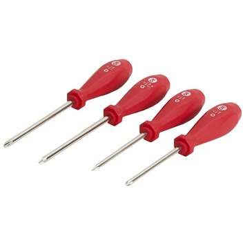 De OK schroevendraaierset bestaat uit 4 verschillende kruiskopschroevendraaiers: Phillips kruiskop PH1 en PH2 (80 en 100 millimeter) en Pozidriv kruiskop PZ1 en PZ2 (80 en 100 millimeter). De OK kruiskopschroevendraaiers zijn voorzien van een kunststof handgreep.