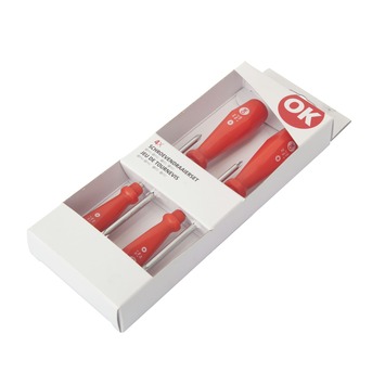 De OK schroevendraaierset bestaat uit 4 verschillende kruiskopschroevendraaiers: Phillips kruiskop PH1 en PH2 (80 en 100 millimeter) en Pozidriv kruiskop PZ1 en PZ2 (80 en 100 millimeter). De OK kruiskopschroevendraaiers zijn voorzien van een kunststof handgreep.