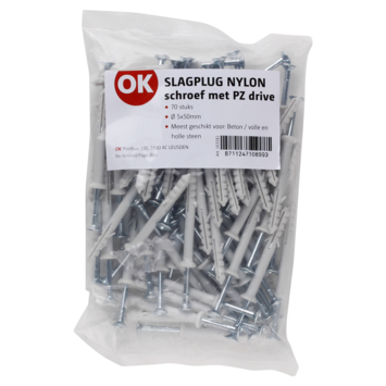 De OK Slagplug nylon Ø 5x50mm met schroef is geschikt voor toepassing op verschillende soorten materialen zoals beton, wandverbinding en metaal. Nagelpluggen zijn zeer geschikt voor het monteren van houten regelwerk (zoals plinten). De werkwijze is anders dan bij een gewone plug en daarom is deze plug ook wel bekend als spijkerplug of nagelplug. Je slaat de plug namelijk met een hamer in het boorgat. Gebruik voor het boren van het gat een boor met een doorsnede van 5mm. De plug is 50mm lang. Bijpassende schroeven zijn 55mm lang en hebben een doorsnede van Ø 3,3 mm. Een verpakking bevat 70 slagpluggen.