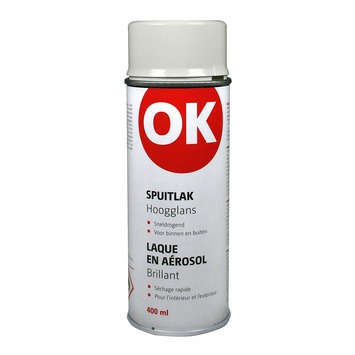 OK spuitlak wit hoogglans is een sneldrogende alkyd lak voor ondergronden van hout, metaal, aluminium, glas, steen en diverse soorten kunststof. Uitermate geschikt als finish. Deze spuitlak is zowel binnen als buiten te gebruiken. Eén spuitbus van 400 ml volstaat voor het spuiten van een oppervlakte van 1,5 tot 2 m2. Stofdroog na 15 minuten.