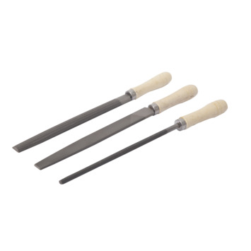 De OK vijlenset bestaat uit de volgende 3 typen vijlen: een platte, een ronde en een halfronde vijl De vijlen zijn voorzien van een stevige houten handgreep.