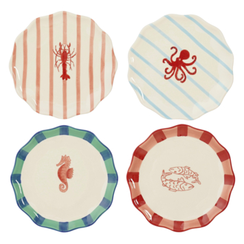 Breng een vleugje kustsfeer naar tafel met deze prachtige ontbijtborden met zeediermotieven. De collectie bestaat uit vier varianten, elk met een uniek ontwerp: van een kreeft en een zeepaardje tot een octopus of een vissenmotief. De witte basis met frisse kleuren en patronen geeft de borden een zomerse, mediterrane uitstraling. Met een diameter van 21 cm zijn ze perfect voor een uitgebreid ontbijt, een brunch in de tuin of een ontspannen start van de dag. Combineer verschillende motieven voor een speelse en stijlvolle tafelsetting die direct uitnodigt om te blijven zitten. Ook mooi om te gebruiken als gebaksbord of als decoratief accent op een open keukenplank. Gemaakt van steengoed.