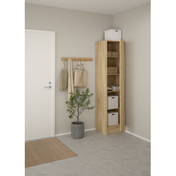 De opbergkast 1-deurs Cosmo eiken spaanplaat 200 x 49,2 x 47,1 cm is een stijlvolle en praktische oplossing voor extra bergruimte in huis. Dankzij de warme eiken kleur en het compacte formaat is deze kast ideaal voor de slaapkamer, hal of werkkamer. Met zijn slimme indeling berg je eenvoudig verschillende spullen overzichtelijk op.