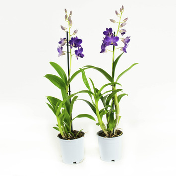 Deze blauwe Thaise orchidee heeft een statig uiterlijk. Met zijn chique blauwe kleur geeft deze orchidee elke interieur direct allure. Deze apart soort orchidee is door zijn kleur en vorm de laatste jaren erg populair. Deze orchidee bestel je per twee stuks en hebben één tak per plant. De orchideeën zijn 50 centimeter hoog.