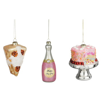 Op zoek naar originele kerstdecoratie? Ga voor dit hangornament! Om de feestvreugde te verhogen is dit glazen hangornament verkrijgbaar in drie vrolijke varianten; een stuk appeltaart, roze fles champagne en een taartplateau met taart. Ook leuk om met elkaar te combineren! Opgemaakt met prachtige glitters valt de kersthanger zeker op in de boom. Door middel van het touwtje kun je hem gemakkelijk ophangen. Daarnaast is deze hanger ook leuk om cadeau te geven tijdens de feestdagen. De afmetingen van de kersthanger zijn H11 xø9 cm.