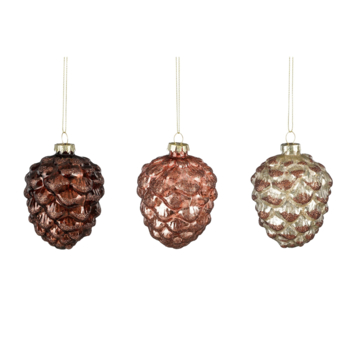 Kerstbal in de vorm van een dennenappel. De kerstbal is gemaakt van glas en verkrijgbaar in drie verschillende varianten, namelijk; bruin, crème en beige. Ook leuk om met elkaar te combineren! De afmetingen zijn H10 xø7 cm. Door middel van het touwtje kun je hem gemakkelijk ophangen.