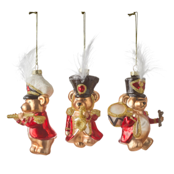 Hoe gezellig zijn deze muziekspelende kerstornamenten in de vorm van een beer? Ze zijn verkrijgbaar met alle drie een ander instrument. De beervormige kerstballen zijn gemaakt van glas en hebben ieder een veer op hun hoed. De afmetingen zijn L8,5 x B5,5 x H11,5 cm.