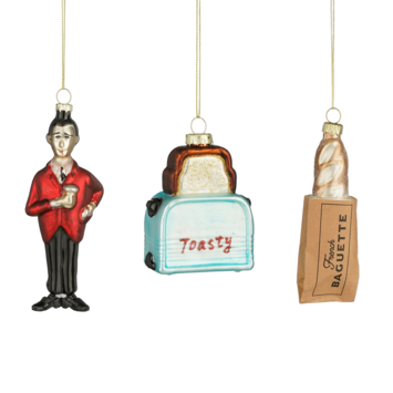 Op zoek naar originele kerstdecoratie? Ga voor dit hangornament! Het ornament is gemaakt van glas en is verkrijgbaar in drie feestelijke varianten; man met bierglas, broodrooster en stokbrood. Ook leuk om met elkaar te combineren! Door middel van het touwtje kun je hem gemakkelijk ophangen, bijvoorbeeld in de kerstboom. Daarnaast is deze hanger ook leuk om cadeau te geven! De afmetingen van de kersthanger zijn L8,5 x B4,5 x H8,5 cm.