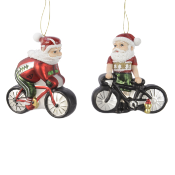 Deze Kerstman zit niet op de arrenslee, maar pakt het sportief aan en zit op de fiets! Deze glashanger geeft jouw kerstcreaties een vrolijke uitstraling.