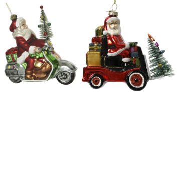 Deze Kerstman zit niet op de arrenslee, maar pakt liever een sneller voertuig! Deze glashanger met veel details geeft jouw kerstcreaties een vrolijke uitstraling.