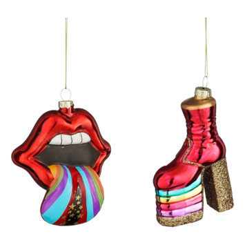 Voeg een pop of colour toe aan je kerstboom met deze kerstornamenten, verkrijgbaar in twee verschillende ontwerpen; lippen met tong en een hak. Ze komen in het rood met kleurrijke details. Ze zijn gemaakt van glas. De lippen met tong heeft de afmetingen L8,5 x B5 x H10 cm en de hak heeft de afmetingen L7 x B3 x H11 cm.