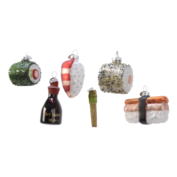 Deze glazen sushi-hangers zijn een vrolijke en opvallende kerstboomversiering. Verkrijgbaar in 6 verschillende vormen. Deze boomdecoratie komt al met een hangertje, zodat je meteen kunt starten met decoreren.