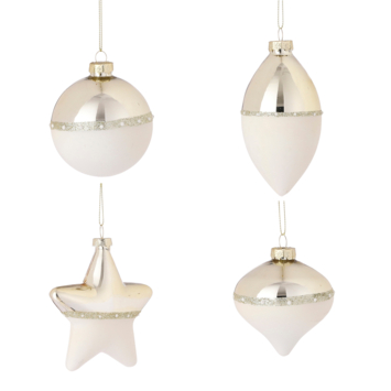 Deze glazen kerstbal valt direct op door het mooie kleurcontrast: een mat witte onderkant met een glanzende, gouden bovenkant. De kleuren worden van elkaar gescheiden door een feestelijke glitterrand. De gouden kerstbal heeft een diameter van ongeveer 8 cm en is verkrijgbaar in vier verschillende vormen. Stijlvol om met elkaar te combineren of met meerdere gouden hangornamenten! Door middel van het touwtje kun je hem gemakkelijk ophangen.