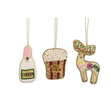 Versier je kerstboom met deze kerstornamenten met kralen! Deze schattige ornamenten, gemaakt van polyester, zijn verkrijgbaar in een fles, een popcornbak en een rendier. De fles heeft afmetingen van L10 x B5 cm, de popcornbak is L8 x B6 cm, en het rendier meet L11 x B8,5 cm. Deze unieke en charmante ornamenten zijn perfect om je kerstboom op te vrolijken en een feestelijke sfeer te creëren.