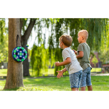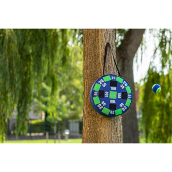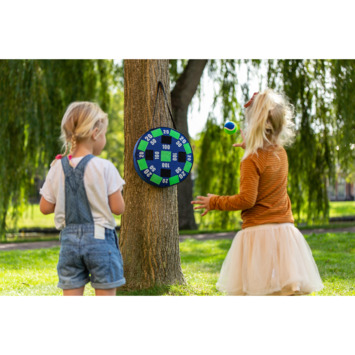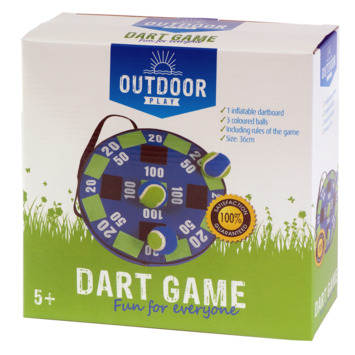 Outdoor Play Dart Game. Gooi jij in de roos? Probeer de meeste punten te halen door de ballen op het grote bord te gooien. Gemakkelijk op te blazen en aan de muur te hangen. Inhoud: 1 groot opblaasbaar dartbord en 3 ballen. Wordt geleverd in full-colour doos met uitgebreide handleiding. Geschikt voor kinderen vanaf 5 jaar.