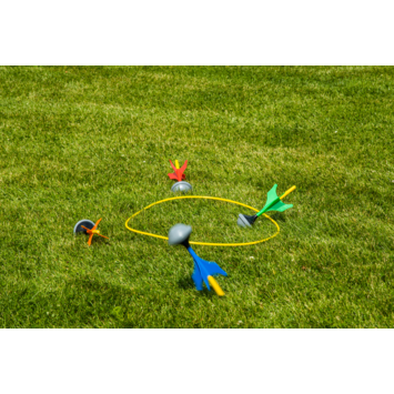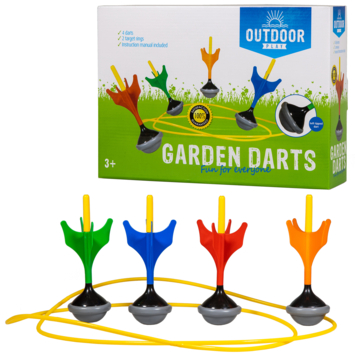 Bij dit spel draait het erom, hoe goed je kunt mikken! Deze Outdoor Play speelset bestaat uit 4 supergrote darts en 2 gele ringen.