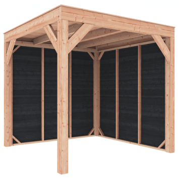 Deze modern vormgegeven overkapping biedt een perfecte balans tussen uitstraling en functionaliteit.De totale afmetingen zijn 245 cm hoog, 255 cm breed en 255 cm diep en heeft een doorloophoogte van 224 cm.Zoek je een overdekte plek voor ontspanning in de tuin? Deze sfeervolle overkapping is een aanwinst voor iedere tuin.Natuurlijke uitstraling, degelijke kwaliteit.De wanden zijn bekleed met Zwart Zweeds rabat en de constructie is gemaakt van onbehandeld Douglas met stevige staanders van 12x12cm.De keuze voor onbehandeld Douglas hout biedt een authentieke uitstraling en staat ook garant voor een lange levensduur.Klaar voor een groene toekomst:Dit modern vormgegeven tuinverblijf is speciaal ontworpen om zonnepanelen of een sedum dak te kunnen ondersteunen, Hierdoor is dit verblijf een duurzame en milieuvriendelijke aanvulling op uw tuin is.Zelf aan de slagDankzij de duidelijke opbouwomschrijving, meegeleverde bevestigingsmaterialen en op maat gezaagde onderdelen, is de installatie van dit tuinhuis een haalbare klus voor iedere gemiddelde doe-het-zelver. Dak bekleding:Wij raden aan om deze Douglas overkapping te voorzien van een EPDM Dak bekleding voor een lekvrij dak (Let op: los bij te bestellen).Onderhoud:Bij het kopen van een overkapping is onderhoud een aandachtspunt… Met Douglas hout heb je het goed voor elkaar, Douglas is namelijk van zichzelf al een sterke houtsoort. Het gaat zonder extra behandeling eenvoudig 10 tot 15 jaar mee. Om de maximale levensduur te verlengen kun je gebruik maken van speciale Douglas beits of Douglas olie en elke 2 jaar opnieuw beitsen of oliën.