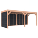Deze modern vormgegeven overkapping biedt een perfecte balans tussen uitstraling en functionaliteit.De totale afmetingen zijn 245 cm hoog, 595 cm breed en 255 cm diep en heeft een doorloophoogte van 224 cm.Zoek je een overdekte plek voor ontspanning in de tuin? Deze sfeervolle overkapping is een aanwinst voor iedere tuin.Natuurlijke uitstraling, degelijke kwaliteit.De wanden zijn bekleed met Zwart Zweeds rabat en de constructie is gemaakt van onbehandeld Douglas met stevige staanders van 12x12cm.De keuze voor onbehandeld Douglas hout biedt een authentieke uitstraling en staat ook garant voor een lange levensduur.Klaar voor een groene toekomst:Dit modern vormgegeven tuinverblijf is speciaal ontworpen om zonnepanelen of een sedum dak te kunnen ondersteunen, Hierdoor is dit verblijf een duurzame en milieuvriendelijke aanvulling op uw tuin is.Zelf aan de slagDankzij de duidelijke opbouwomschrijving, meegeleverde bevestigingsmaterialen en op maat gezaagde onderdelen, is de installatie van dit tuinhuis een haalbare klus voor iedere gemiddelde doe-het-zelver. Dak bekleding:Wij raden aan om deze Douglas overkapping te voorzien van een EPDM Dak bekleding voor een lekvrij dak (Let op: los bij te bestellen).Onderhoud:Bij het kopen van een overkapping is onderhoud een aandachtspunt… Met Douglas hout heb je het goed voor elkaar, Douglas is namelijk van zichzelf al een sterke houtsoort. Het gaat zonder extra behandeling eenvoudig 10 tot 15 jaar mee. Om de maximale levensduur te verlengen kun je gebruik maken van speciale Douglas beits of Douglas olie en elke 2 jaar opnieuw beitsen of oliën.