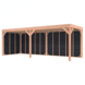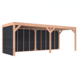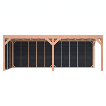 Deze modern vormgegeven overkapping biedt een perfecte balans tussen uitstraling en functionaliteit.De totale afmetingen zijn 245 cm hoog, 695 cm breed en 255 cm diep en heeft een doorloophoogte van 224 cm.Zoek je een overdekte plek voor ontspanning in de tuin? Deze sfeervolle overkapping is een aanwinst voor iedere tuin.Natuurlijke uitstraling, degelijke kwaliteit.De wanden zijn bekleed met Zwart Zweeds rabat en de constructie is gemaakt van onbehandeld Douglas met stevige staanders van 12x12cm.De keuze voor onbehandeld Douglas hout biedt een authentieke uitstraling en staat ook garant voor een lange levensduur.Klaar voor een groene toekomst:Dit modern vormgegeven tuinverblijf is speciaal ontworpen om zonnepanelen of een sedum dak te kunnen ondersteunen, Hierdoor is dit verblijf een duurzame en milieuvriendelijke aanvulling op uw tuin is.Zelf aan de slagDankzij de duidelijke opbouwomschrijving, meegeleverde bevestigingsmaterialen en op maat gezaagde onderdelen, is de installatie van dit tuinhuis een haalbare klus voor iedere gemiddelde doe-het-zelver. Dak bekleding:Wij raden aan om deze Douglas overkapping te voorzien van een EPDM Dak bekleding voor een lekvrij dak (Let op: los bij te bestellen).Onderhoud:Bij het kopen van een overkapping is onderhoud een aandachtspunt… Met Douglas hout heb je het goed voor elkaar, Douglas is namelijk van zichzelf al een sterke houtsoort. Het gaat zonder extra behandeling eenvoudig 10 tot 15 jaar mee. Om de maximale levensduur te verlengen kun je gebruik maken van speciale Douglas beits of Douglas olie en elke 2 jaar opnieuw beitsen of oliën.
