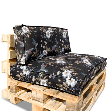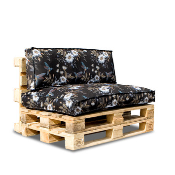 Met de palletkussens Kolibri maak je van een pallet heel gemakkelijk een comfortabele zitplaats. De zwarte fluweelachtige kussens bestaan uit een zit- en een ruggedeelte. Daarop is een herhalend patroon van een ijsvogel in de natuur op geprint. Het buitenmateriaal bestaat uit 100% polyester en de vulling is gemaakt van 100% blended foam. Hierin is een deel memory foam verwerkt zodat het kussen altijd mooi terug in model komt. Het palletkussen wordt exclusief onderstel geleverd.