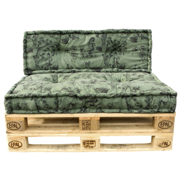 Met de palletkussens Sinne maak je van een pallet heel gemakkelijk een comfortabele zitplaats. De groen gewassen canvas kussens met print bestaan uit een zit- en een ruggedeelte. Zowel het binnen- als het buitenmateriaal bestaat uit 100% katoen. Het palletkussen wordt exclusief onderstel geleverd.