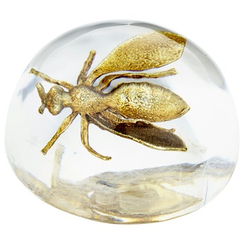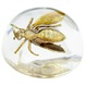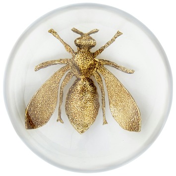 Papiergewicht met gouden insect . Nep insecten en opgezette dieren zijn de blikvangers in de woonbladen. Karwei heeft de insecten uitgewerkt op verschillende manieren. Hier zijn ze gevangen in een paperweight. Gelukkig zijn ze helemaal nep en toch heel decoratief. Leuk voor op je bureau of salontafel.