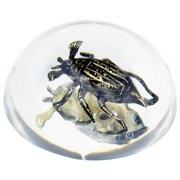 Papiergewicht met zwarte insect . Nep insecten en opgezette dieren zijn de blikvangers in de woonbladen. Karwei heeft de insecten uitgewerkt op verschillende manieren. Hier zijn ze gevangen in een paperweight. Gelukkig zijn ze helemaal nep en toch heel decoratief. Leuk voor op je bureau of salontafel.