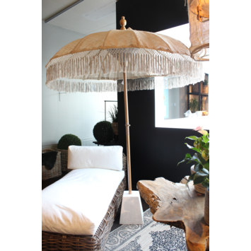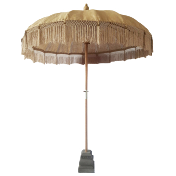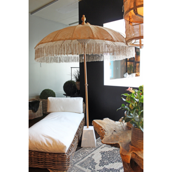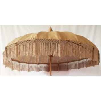 De prachtige handgemaakte parasol Bali jute is versierd met franjes. De stok en de top van de parasol is decoratie versierd houtsnijwerk. Deze parasol is een echte sfeermaker!