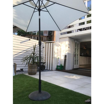 De Parasol Lombok Ecru Ø270 cm is een prachtige ecrukleurige parasol. Deze parasol biedt een heerlijk plekje in de schaduw tijdens warme zomerse dagen. De parasol bestaat uit een polyester doek en een metalen stok. Onder deze parasol kun je heerlijk afkoelen met een koud glas drinken in je hand, terwijl de zon de rest van je tuin verhit. Parasol Lombok heeft een diameter van 270 centimeter. Dankzij deze ruime diameter is het een grote parasol die wel wat hulp kan gebruiken. Een voetstuk met minimaal 40 kg aan voetgewicht zorgt ervoor dat de parasol ook stabiel staat als de wind wat aantrekt. Het voetstuk en de eventuele tegels die je gebruikt om deze te verzwaren zijn niet inbegrepen, maar hebben wij wel in ons assortiment. Let altijd goed op de dikte van de stok. Bij deze parasol is de diameter 3,8 cm. Het is natuurlijk wel zo handig dat deze in het voetstuk past.