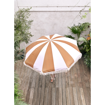 Op zoek naar een stijlvolle parasol voor je tuin, terras of balkon? Deze ronde parasol in een warme okergele kleur met witte strepen voegt direct een zomerse sfeer toe aan je buitenruimte. Met een royale diameter van 250 cm biedt de parasol een ruime schaduw, ideaal voor zonnige dagen. De hoogte is verstelbaar, zodat je de parasol perfect kunt afstemmen op jouw zithoek. Gemaakt van stevig kunststof en eenvoudig in gebruik. Bovendien wordt hij geleverd met een beschermhoes, zodat je hem netjes kunt opbergen wanneer je hem niet gebruikt. Perfect voor een relaxte dag in de schaduw!