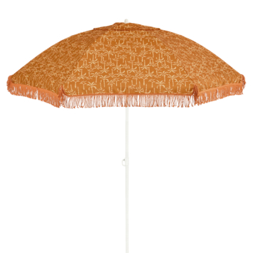 Geniet van de zon zonder in te leveren op stijl met deze bruin/oranje parasol met speelse franjes. De vrolijke palmbomenprint en de franjes geven jouw tuin of terras direct een zomerse uitstraling. Met een hoogte van 238 cm en een diameter van 200 cm creëer je een royaal schaduwplekje waar je comfortabel kunt ontspannen. Het kantelmechanisme laat je de parasol precies zo instellen dat je altijd in de schaduw zit. Het stevige polyester doek is licht in gewicht en de stok is van robuust materiaal, waardoor opzetten en verplaatsen eenvoudig gaat. Dankzij de meegeleverde hoes neem je de parasol moeiteloos mee naar het park of strand, terwijl hij ook bescherming biedt wanneer hij niet in gebruik is.