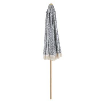 De parasol Portimao heeft een rond doek van zwart/wit gestipt polyester met franjes en een stevige aluminium stok. Halverwege de stok zit een hendel waarmee je de parasol gemakkelijk kunt uitklappen. Deze parasol is zowel functioneel als decoratief en heeft een moderne uitstraling.