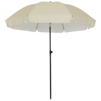 Met de Rimini parasol van 200 cm creëer je snel een fijne schaduwplek op het strand of in de tuin. Het beige polyester doek geeft een rustige uitstraling en beschermt tegen fel zonlicht dankzij UV-beschermingsfactor 50.