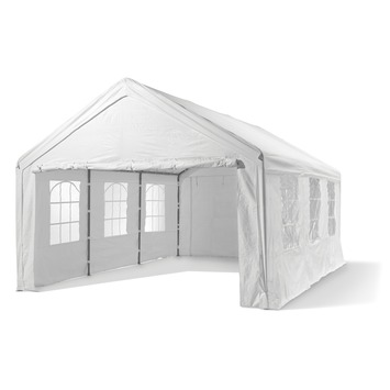 De Partytent Festival Wit 400x600x305 cm is een rechthoekige partytent gemaakt uit een extra stevig buizenframe van gepoedercoat staal, bekleed met een doek van polyethyleen met versterkte randen en hoeken in de kleur wit. De tent is waterdicht, zodat je feestjes niet in het water zullen vallen. Bovendien is de partytent festival geheel compleet met zijwanden. Zo blijft de warmte binnen en heb je geen last van wind en regen. De partytent is verkrijgbaar in meerdere afmetingen.