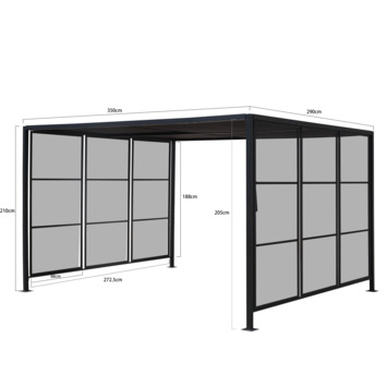 Het paviljoen beschikt over een schuifbaar dak een zonwerend doek, hiermee kun je schaduw creëren waar je maar wilt. Deze tuinpaviljoen is voorzien van een stevig staal gecoat frame met poten van 5x5 cm. De nokhoogte is 210 cm.