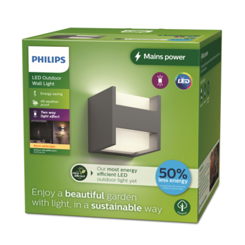 Ben je op zoek naar een energiezuinige buitenlamp? De Philips Arbour buitenwandlamp met UltraEfficient technologie maakt gebruik van nieuwe technologie om zowel de CO2-uitstoot als materiaalverspilling te verminderen. Bovendien het energieverbruik te verlagen met wel 50% energiebesparing. Met een levensduur van 50.000 uur biedt deze waterbestendige (IP44) buitenlamp een levensduur die meer dan 3 keer langer is dan vergelijkbare LED-buitenverlichting van Philips. Verlicht je voordeur of terrasmuur met deze antracietkleurige wandlamp met warmwit licht.