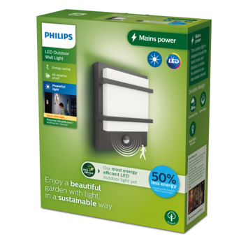 De Philips Petronia LED-buitenwandlamp heeft een lichtpaneel in een antracietgrijs aluminium frame met bewegingssensor. Ultra Efficient-buitenlampen maken gebruik van baanbrekende nieuwe technologie om meer energie dan ooit te besparen en materiaalverspilling tegen te gaan. Met een verbazingwekkende levensduur van 50.000 uur gaan deze lampen meer dan twee keer langer mee dan standaard LED-buitenlampen van Philips en verbruiken ze 50% minder energie - precies wat nodig is voor een duurzamere planeet.