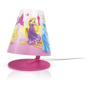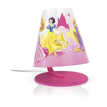 De Philips Disney tafellamp Princess is een kleurrijke lamp. De lamp staat op een roze voet en op de kap zijn prinsessen afgebeeld. De vrolijke lamp is voorzien van LED-technologie en wordt niet warm. De lamp is dus ook heel veilig voor je kind. Je kunt de lamp eenvoudig en snel aan- en uitschakelen met behulp van de schakelaar. De tafellamp is geschikt voor op het nachtkastje maar ook als bureaulamp.