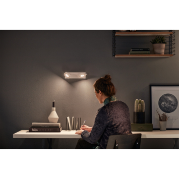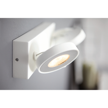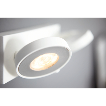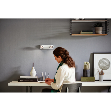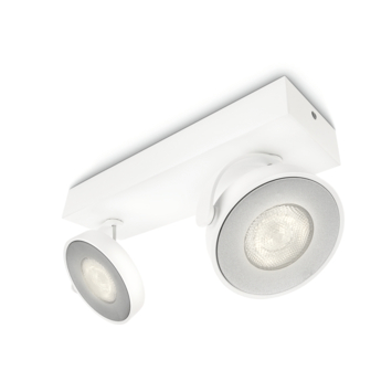 De Philips myLiving duospot uit de serie Clockwork is een mooie, moderne spot voor in jouw interieur. De lamp is voorzien van twee draaibare spots, waardoor de lamp perfect af te stellen is in de gewenste richting. De witte kleur geeft een frisse touch aan jouw ruimte. Het click!FIX systeem maakt deze lamp uitermate eenvoudig te monteren. Deze spot wordt geleverd inclusief WarmGlow LED-lichtbron. Dit betekent dat hoe meer je de spot dimt, deze steeds warmer licht geeft.
