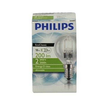 De Philips EcoClassic halogeenlamp kogel helder E14 18W (= 23W) is geschikt voor een E14 fitting. De lamp heeft een vermogen van 18 watt, hiermee heeft de lamp een lichtopbrengst van 204 lumen. Het heldere, warm witte licht van deze lamp heeft een natuurlijke uitstraling waarin de kleuren van je interieur goed tot hun recht komen. Ook heeft de lamp een levensduur van 2000 uur, twee keer zo lang als een standaard lamp. Met deze lamp heb je dus sprankelend licht in de vertrouwde vorm, met een langere levensduur. De lamp schijnt direct met maximale helderheid. Tevens kun je de lamp dimmen, waardoor je gemakkelijk de hoeveelheid licht kunt bepalen.