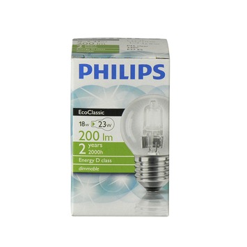 De Philips EcoClassic halogeenlamp kogel helder E14 18W (= 23W) is geschikt voor een E27 fitting. De lamp heeft een vermogen van 18 watt, hiermee heeft de lamp een lichtopbrengst van 204 lumen. Het heldere, warm witte licht van deze lamp heeft een natuurlijke uitstraling waarin de kleuren van je interieur goed tot hun recht komen. Ook heeft de lamp een levensduur van 2000 uur, twee keer zo lang als een standaard lamp. Met deze lamp heb je dus sprankelend licht in de vertrouwde vorm, met een langere levensduur. De lamp schijnt direct met maximale helderheid. Tevens kun je de lamp dimmen, waardoor je gemakkelijk de hoeveelheid licht kunt bepalen.