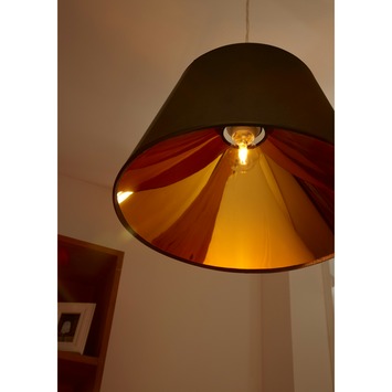 lamp bromt niet en heeft geen hinderlijke schitteringen, geeft mooi licht in onze designlamp waar iedere meteen op af loopt in ons nieuwe huis